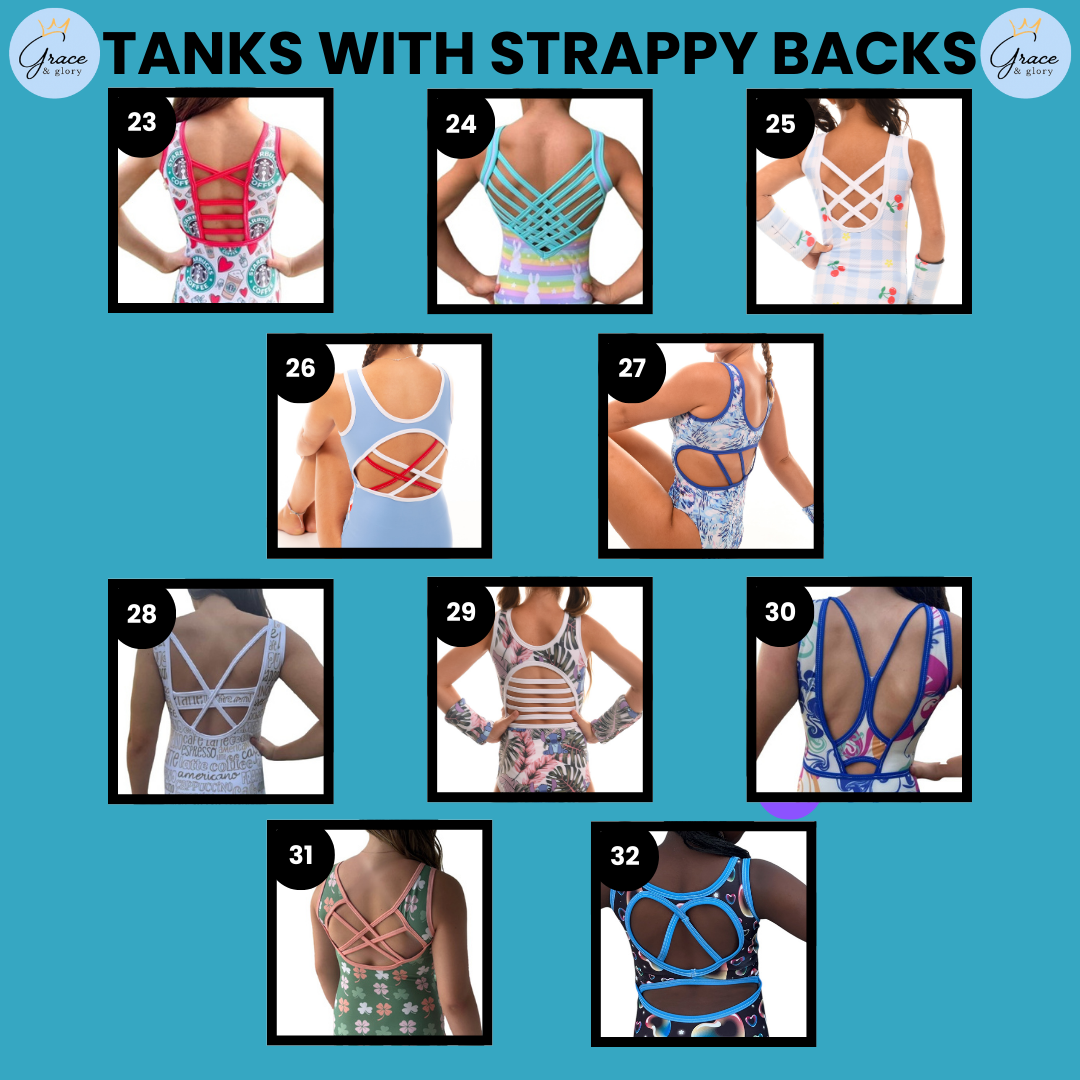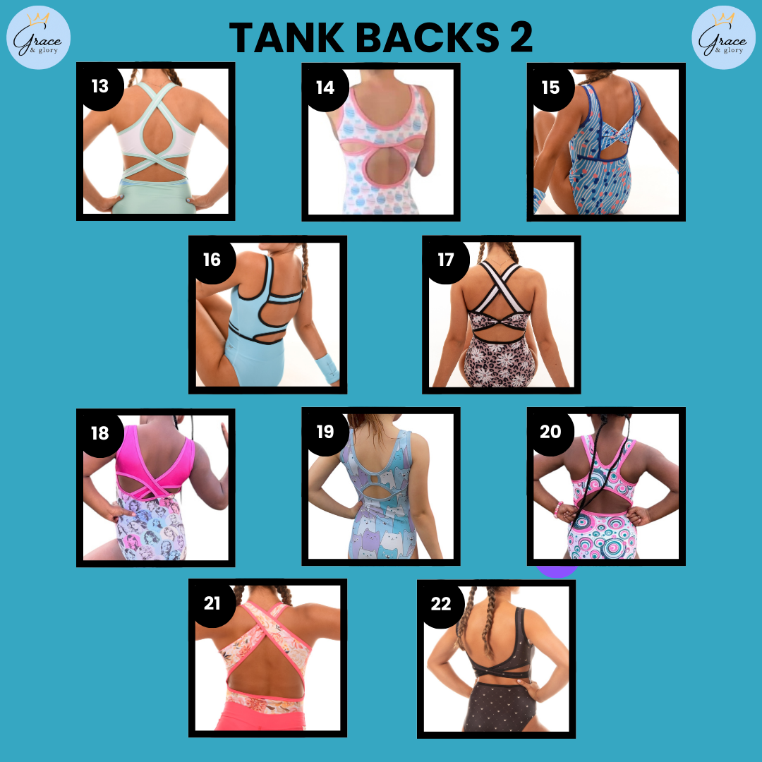 Each leotard comes with the option to choose your own back! Look through the back options in the images, choose your favorite, and insert the number in the "Custom Back #" box below.
